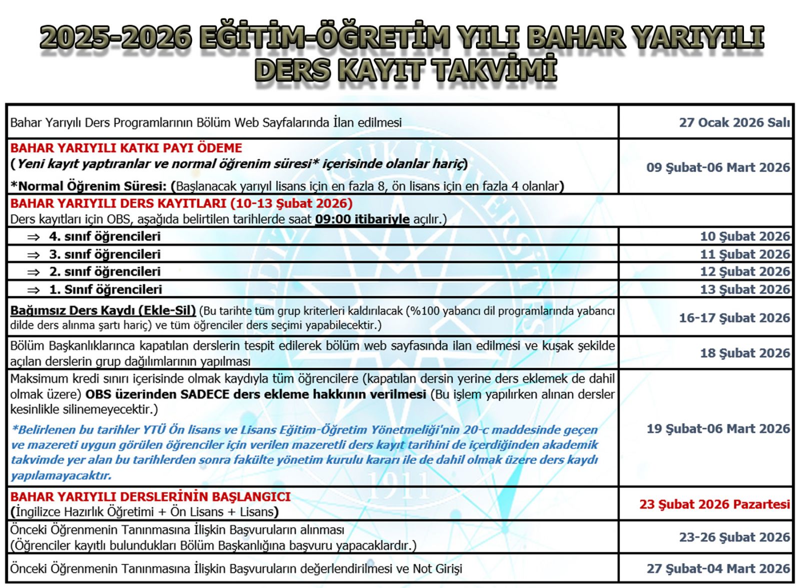 2025-2026 Eğitim-Öğretim Yılı Bahar Yarıyılı ders kayıtlarıyla ilgili önemli konular hakkında aşağıda bilgi verilmiştir.