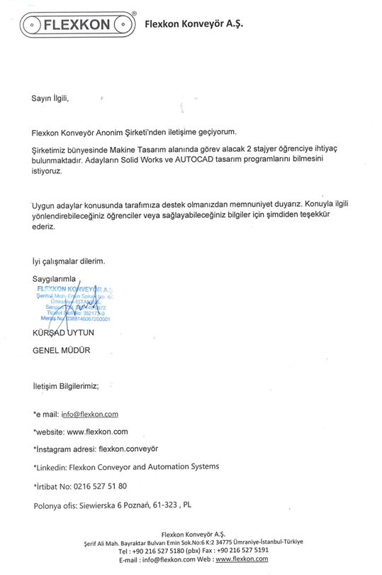 FLEXKON firması Makine Tasarım alandın görev alacak stajyer alımı ile ilgili duyurusu,