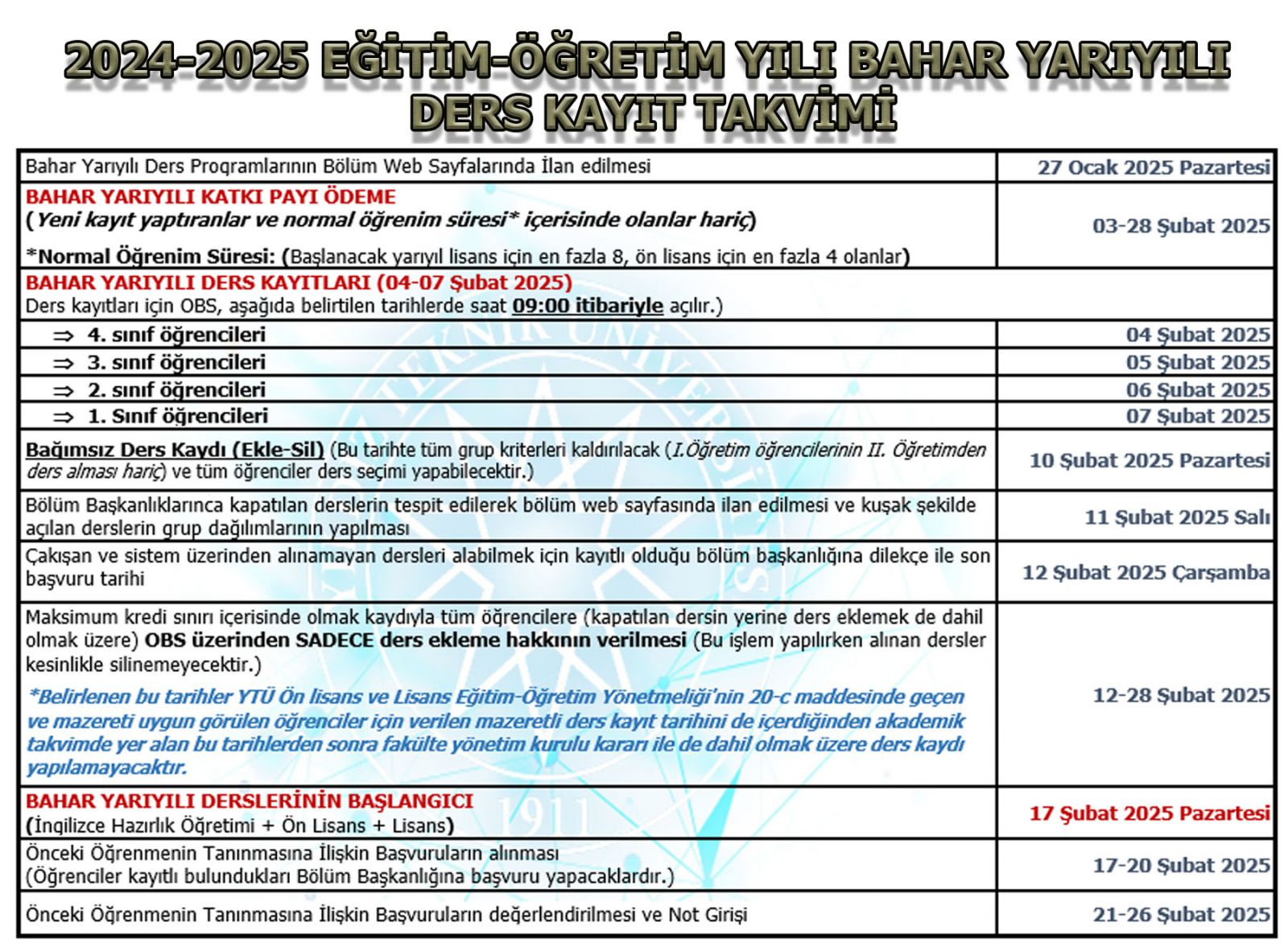 2024-2025 Eğitim Öğretim Yılı Bahar Yarıyılı ders kayıtlarına ait önemli bilgiler aşağıda verilmiştir.